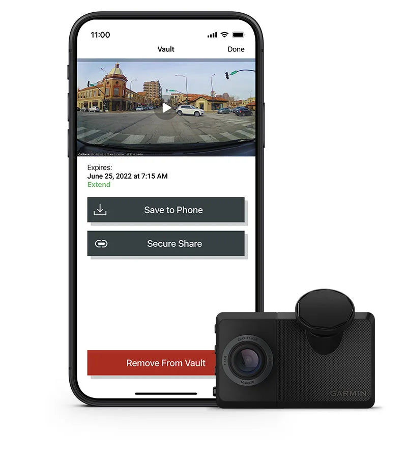 Stale połączona kamera samochodowa z technologią LTE umożliwia podgląd na żywo i udostępnianie zapisanych filmów w dowolnym momencie za pomocą aplikacji Garmin Drive™ na smartfonie.