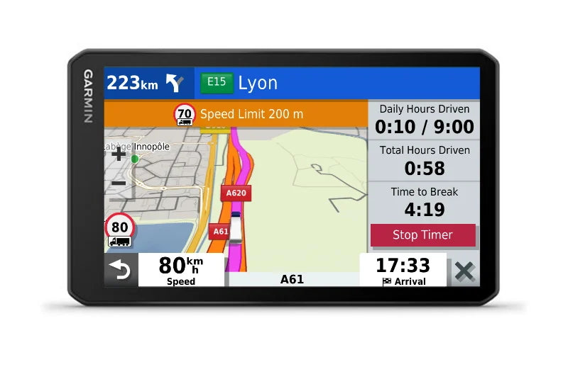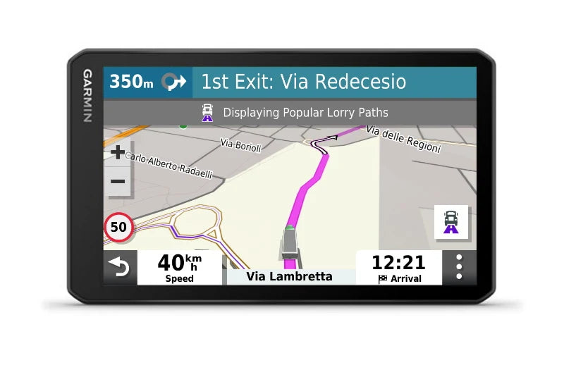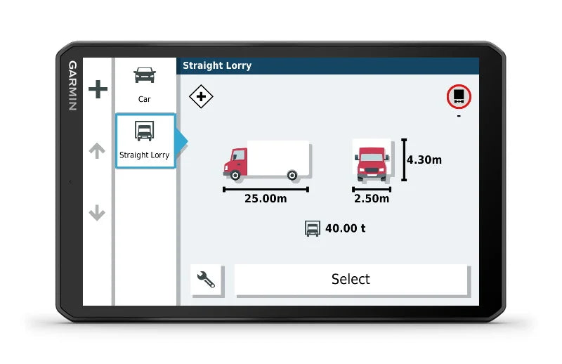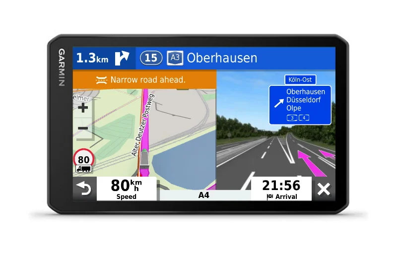 Urządzenie nawigacyjne z czytelnym 7-calowym ekranem, które wyznacza trasy dla ciężarówek na podstawie rozmiarów i masy pojazdu, zapewniając zawodowym kierowcom wyraźny podgląd drogi do przebycia.