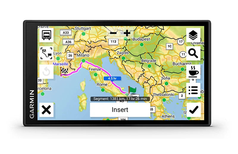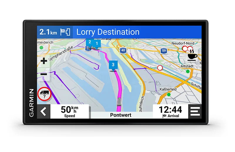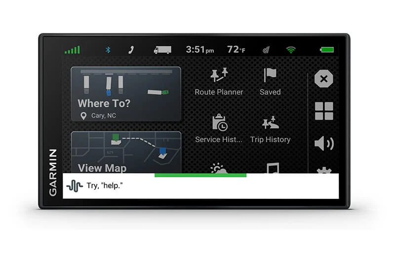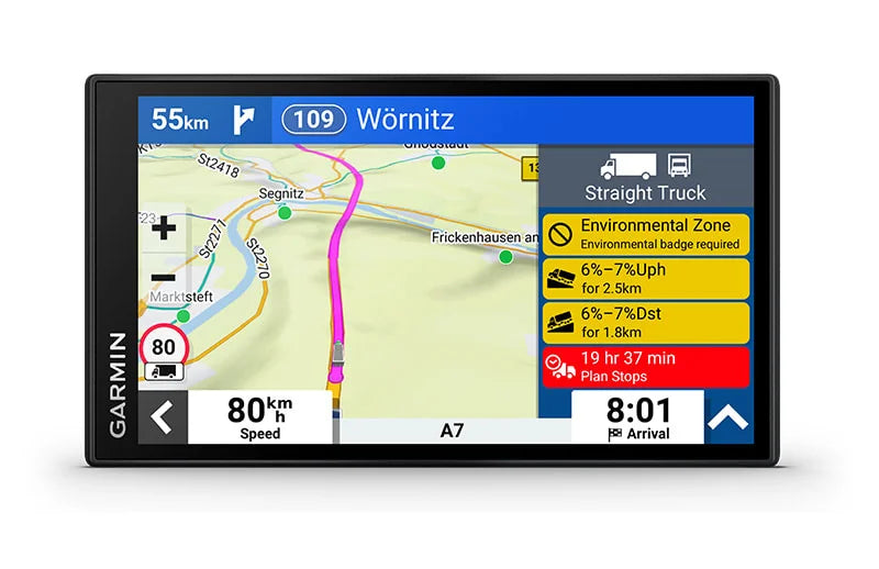 To 6″ urządzenie nawigacji satelitarnej jest wyposażone w funkcje wyznaczania tras dla pojazdów ciężarowych1 na podstawie rozmiarów i masy pojazdu, wyświetlania ważnych wskazówek dotyczących tankowania i przerw oraz w zaawansowaną funkcję planowania przybycia.