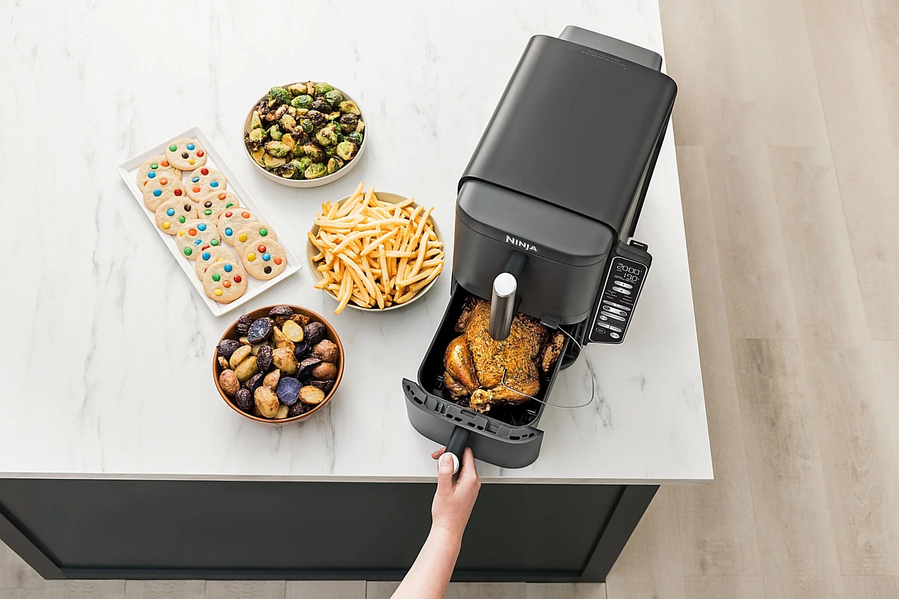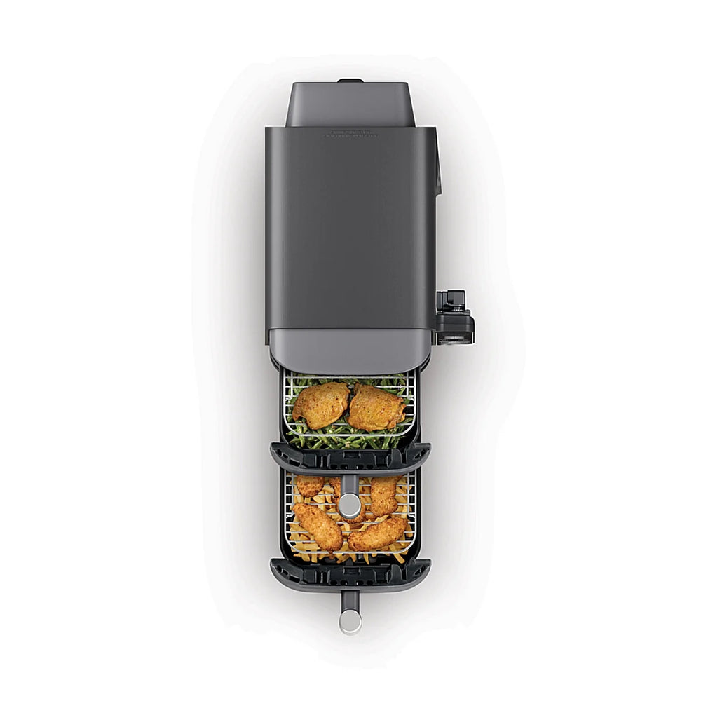 Dowolnie łącz 6 funkcji gotowania, dobieraj czas i temperaturę niezależnie w każdej z dwóch szufladach, a włączając funkcję SYNC będziesz mieć pewność, że wszystkie potrawy będą gotowe jednocześnie. Termometr znajdujący się w tym zestawie pomaga kontrolować stopień wysmażenia potrawy. To wszystko możliwe jest teraz nawet w mniejszych kuchniach!