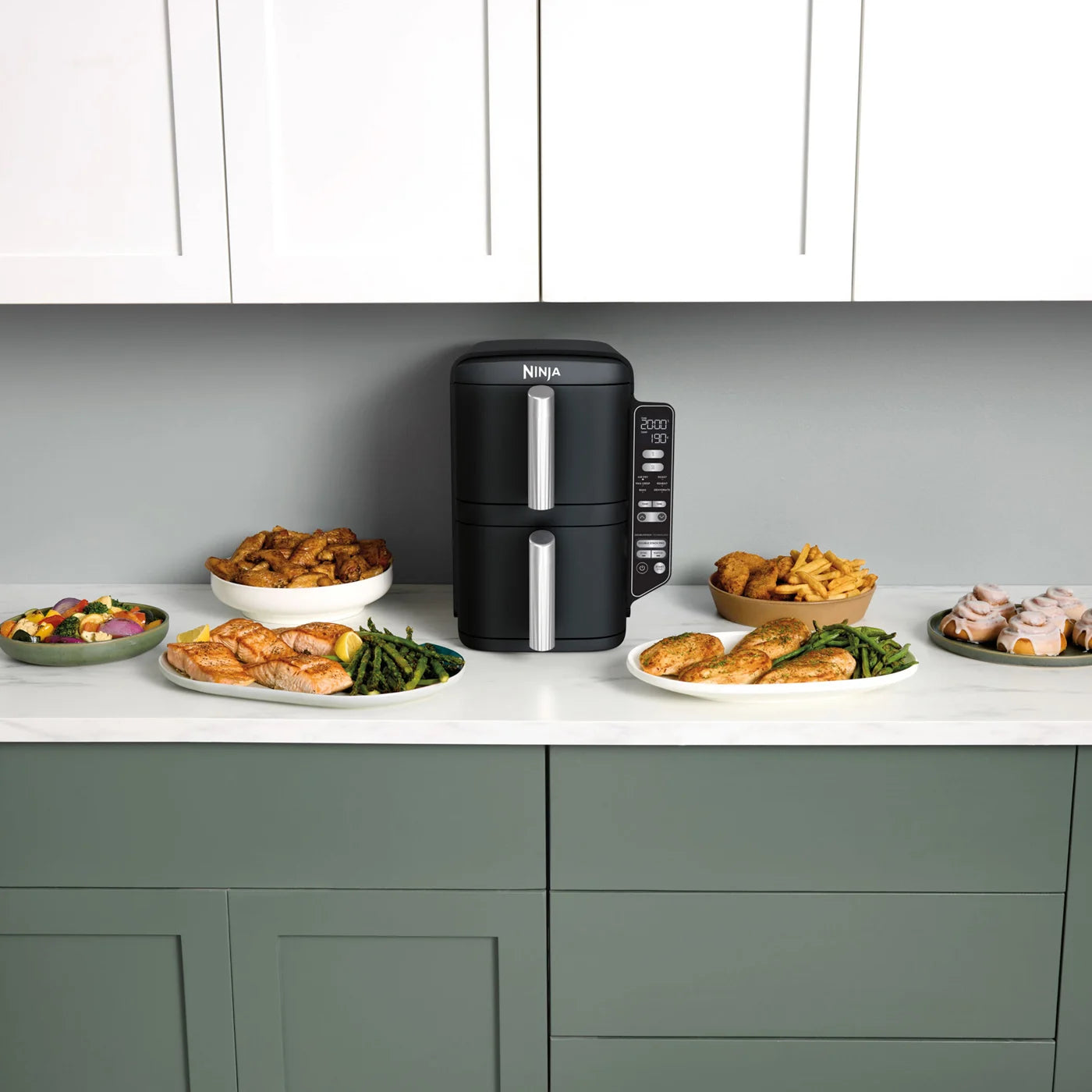 Frytkownica beztłuszczowa Ninja DoubleStack XL SL300EU to doskonałe rozwiązanie dla osób, które potrzebują większego urządzenia do smażenia na gorące powietrze, ale mają ograniczoną przestrzeń na blacie kuchennym. Dzięki pionowemu ułożeniu dwóch niezależnie sterowanych szuflad urządzenie zajmuje znacznie mniej miejsca niż tradycyjne modele, zapewniając jednocześnie pełną funkcjonalność.