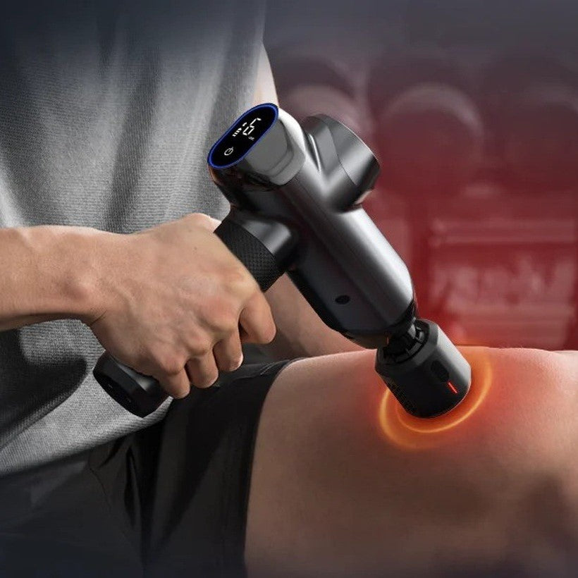 - Profesjonalny pistolet do masażu łączący terapię perkusyjną z ciepłem i zimnem.